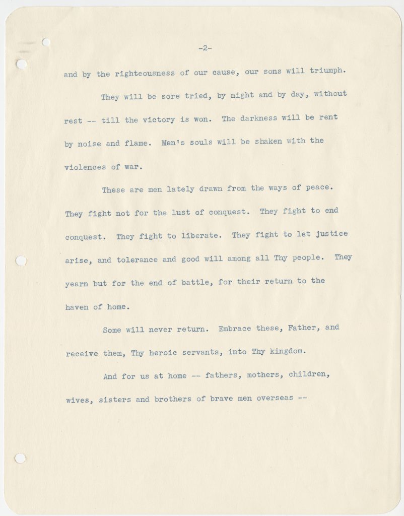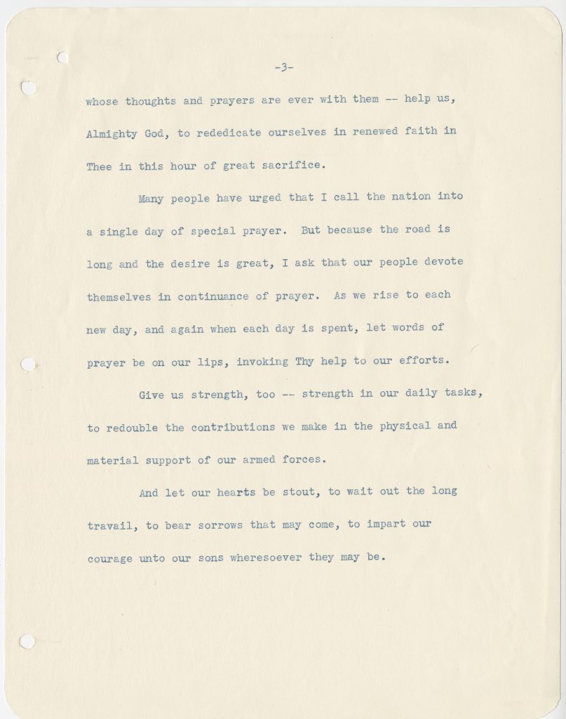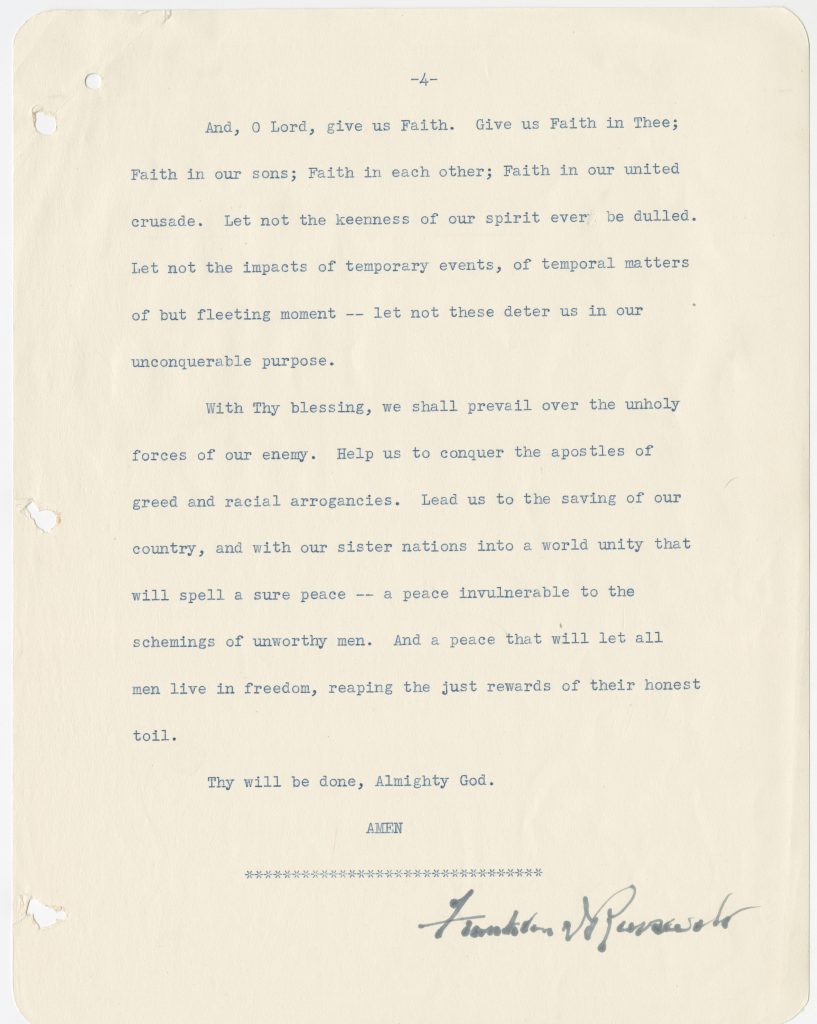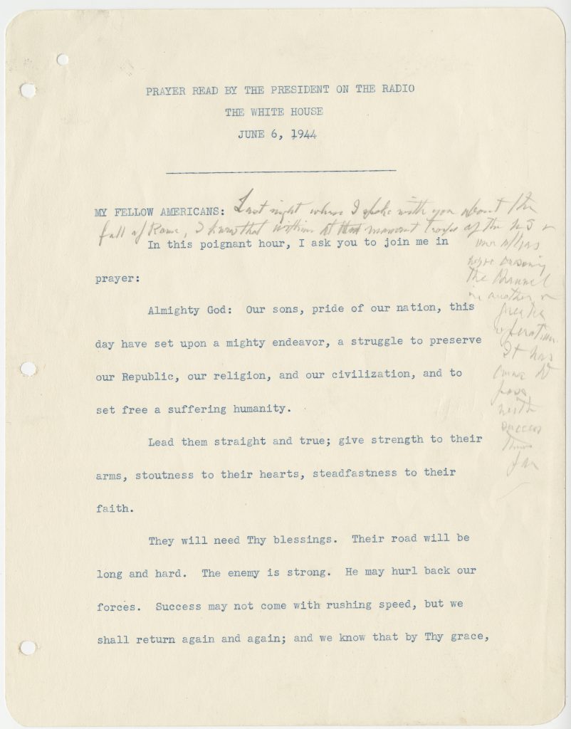 FDR’s address took the form of a prayer. He had composed it during the weekend before the invasion, with assistance from his daughter, Anna, and her husband, John Boettiger. The text was released in advance so Americans could recite it with him. Roosevelt’s “D-Day Prayer” struck a powerful chord with the nation. Printed copies were distributed and displayed widely throughout the remainder of the war.