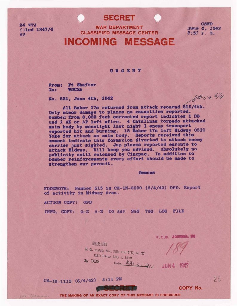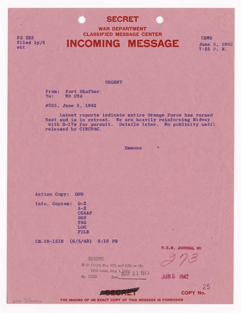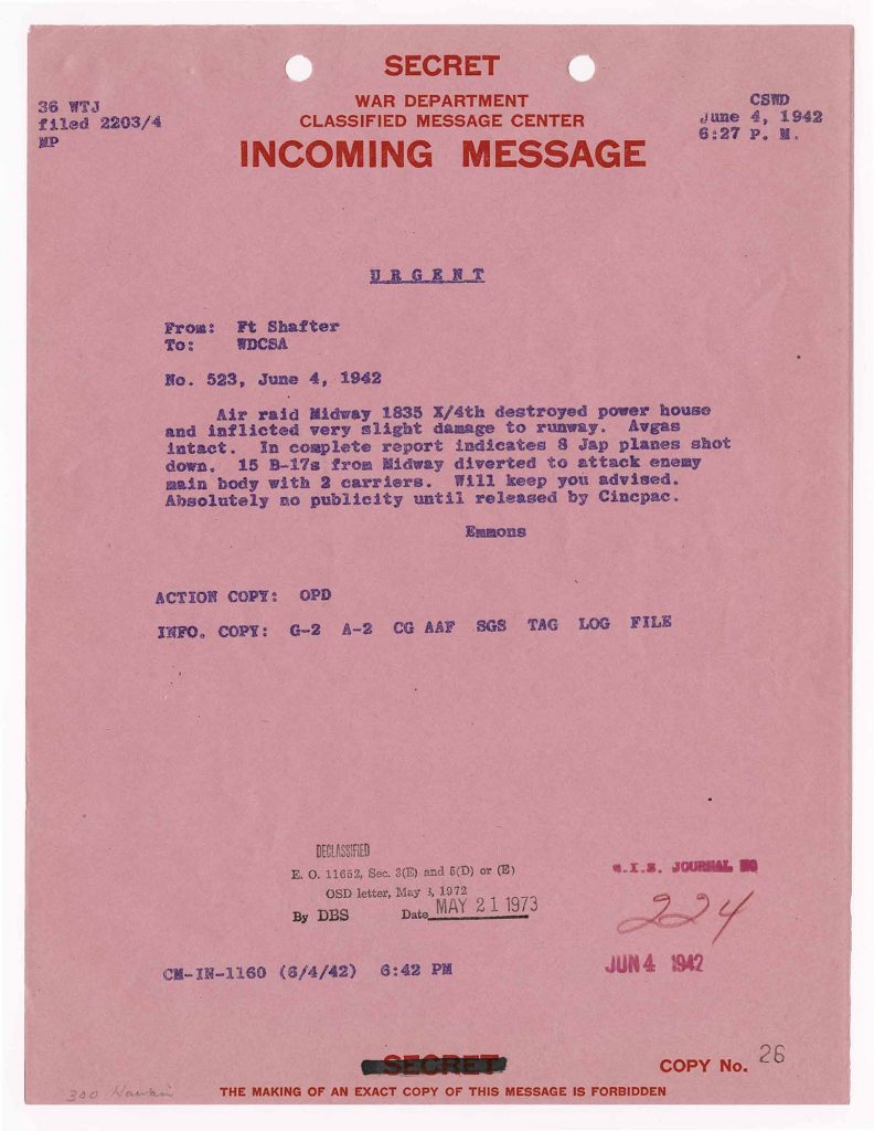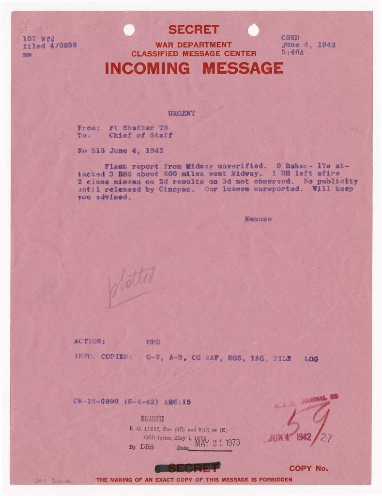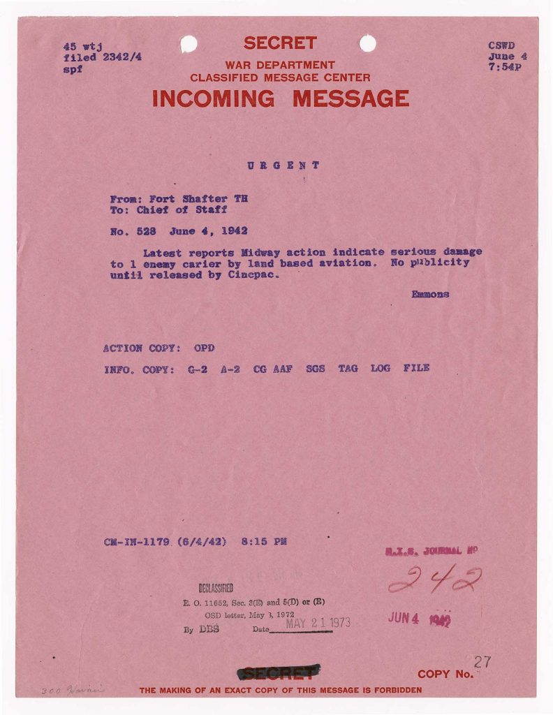The Japanese launched their attack early on the morning of June 3, 1942. This is the first message received at the White House at around 6:00 am.