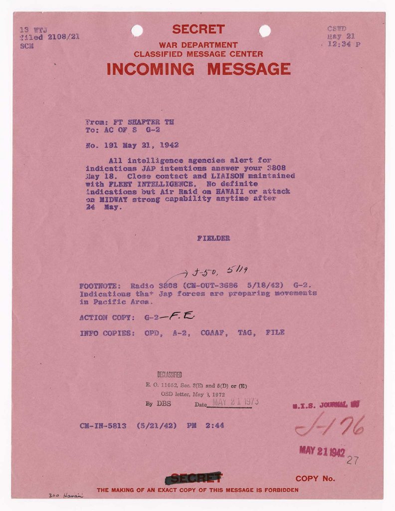 The following secret messages are part of FDR’s Map Room archive. They were sent to Chief of Staff General George Marshall at the White House. These documents were not declassified until 1973 and have never been published in this form before. The first one arrived on May 21st, revealing that the U.S. Navy knew an attack was coming.