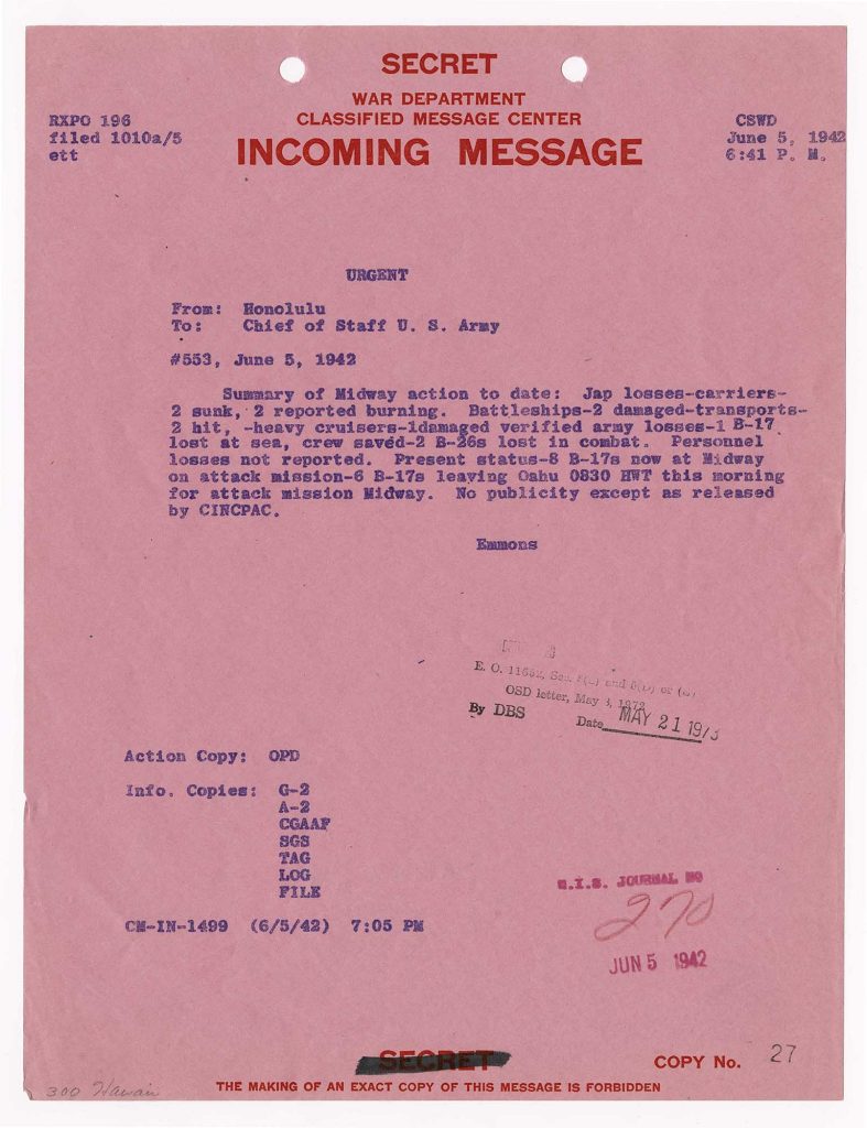 There was confusion on both sides, but it was becoming clear that the Americans were winning. Finally at 6:00pm on June 5th a summary report reached the White House outlining the results of the battle.