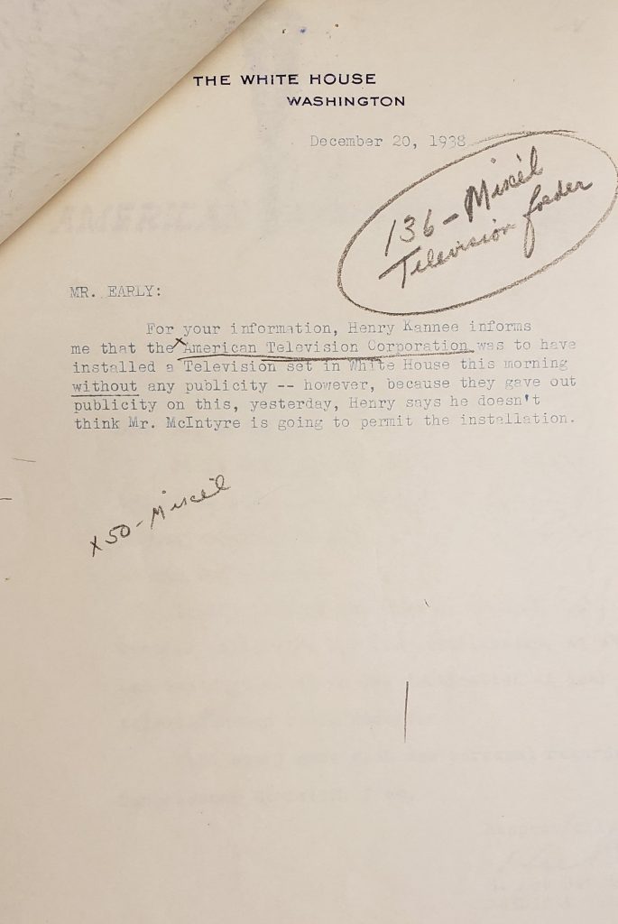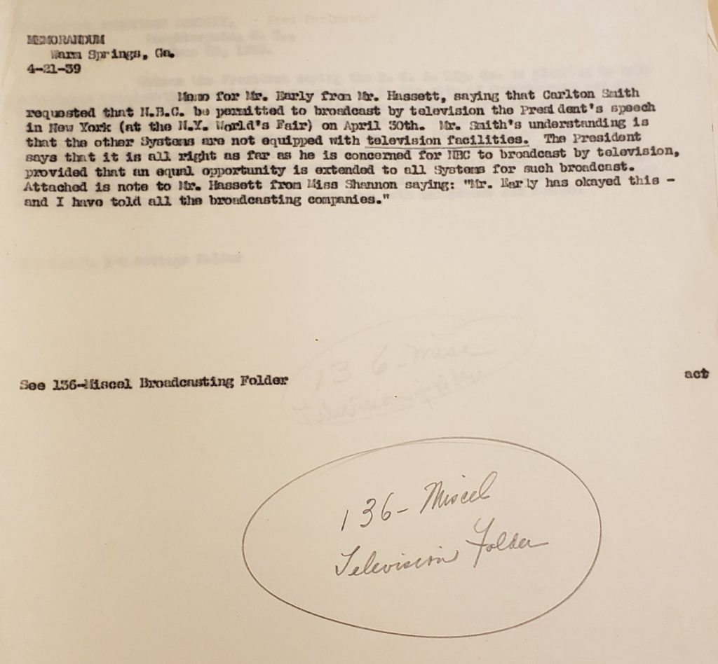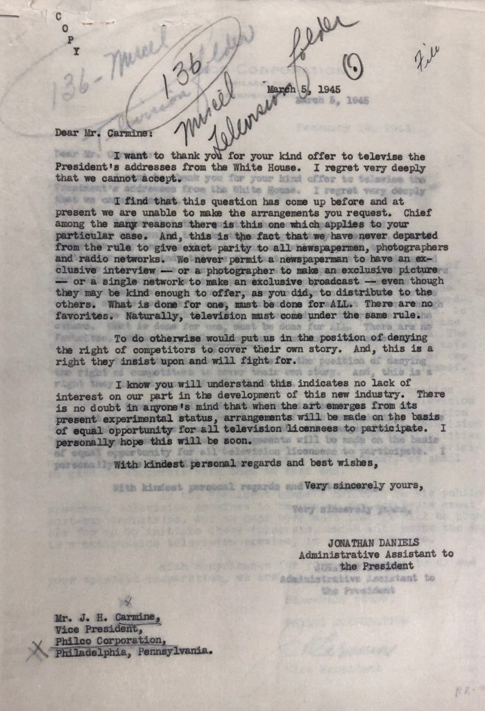 FDR’s aides resisted efforts by NBC to broadcast the President’s White House speeches in March 1945. We can speculate that it had as much to do with the President’s appearance and declining health as it did with fairness (see letter below). CBS and Dumont would most likely have found a way to make it work if given the chance. And radio, print, and newsreel pool coverage had worked during the war. FDR would die five weeks later.