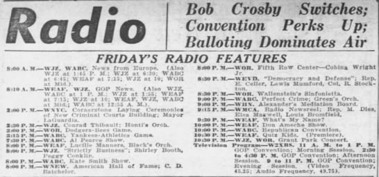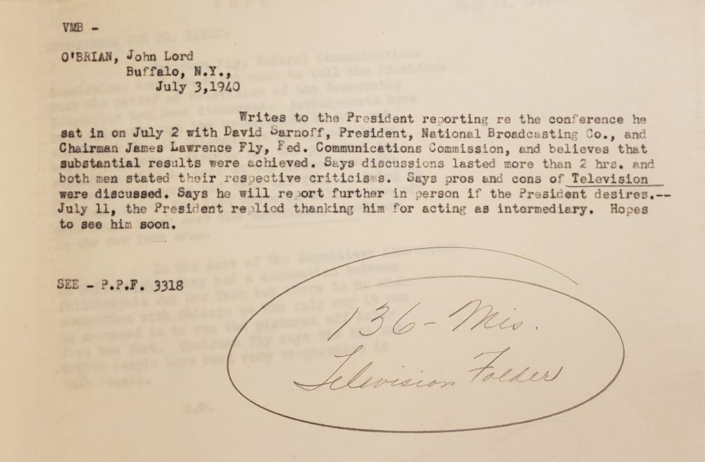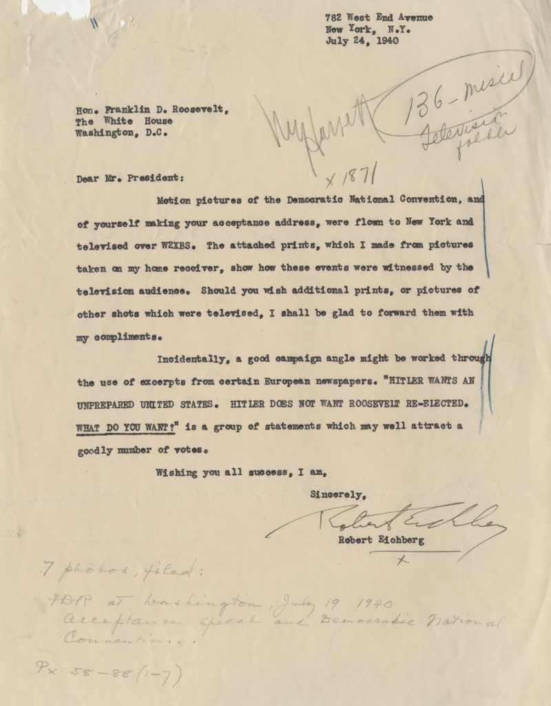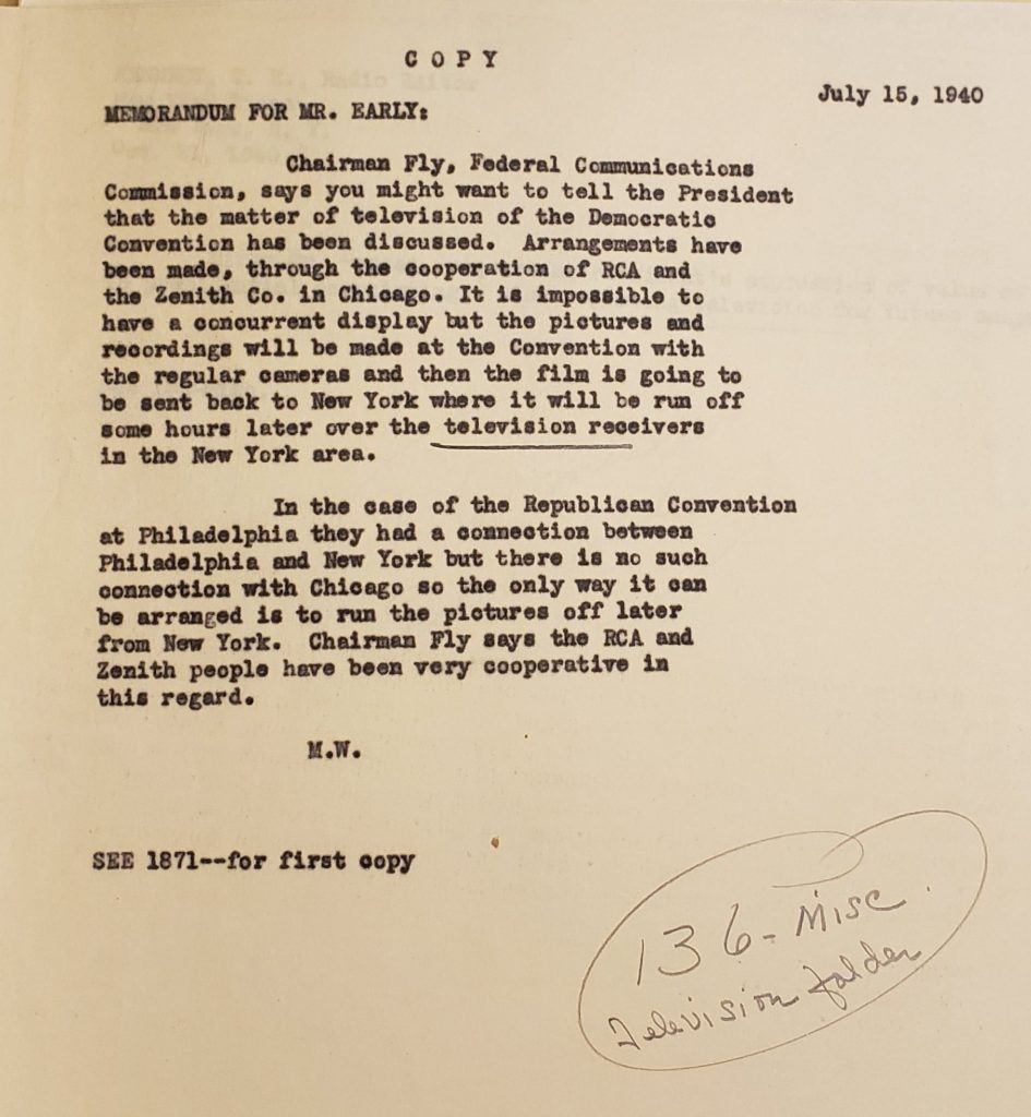 Recognizing the success of the Republican coverage, and knowing they had an unusual opponent in Wendell Willkie, Democrats agreed to this arrangement. Each day at 3:30 PM and 9:00 PM, the network would broadcast the ten-minute films. With no plans to attend the convention, FDR approved the plan. He would follow the convention by radio and telephone from the White House—not by TV.