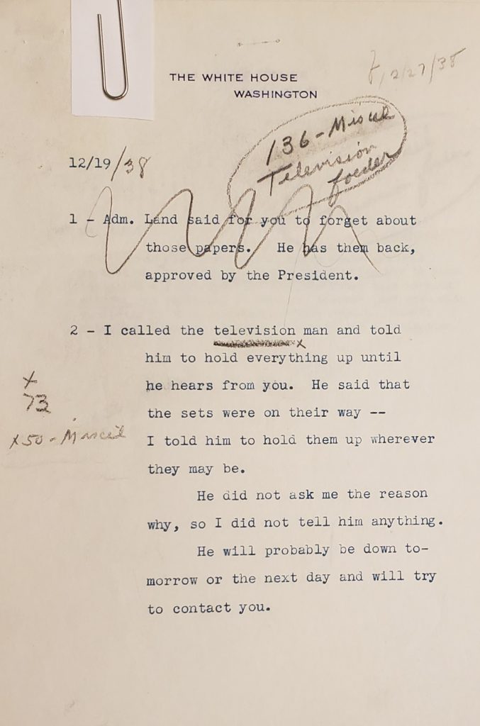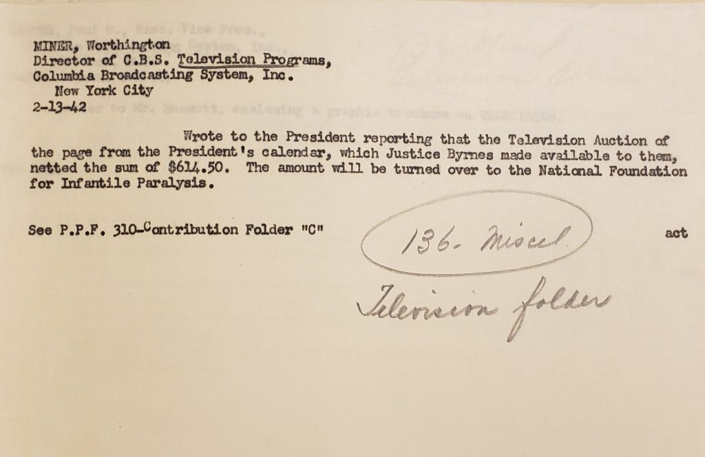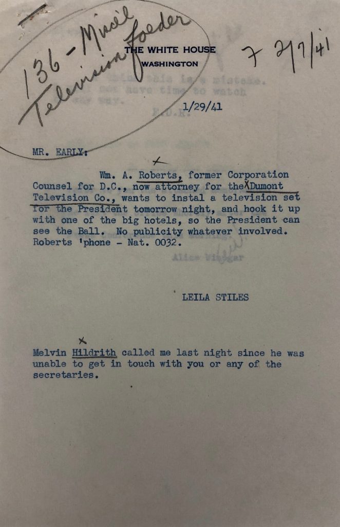NBC maintained a meager television schedule during the war years. Other organizations, such as Dumont (an early TV network after the war), also tried to interest the President in televising events, such as his 1941 birthday ball. The telecast would come directly to the White House from a Washington, DC, hotel, enabling the President to see, not simply hear over radio, the festivities. His response was a terse “no.”