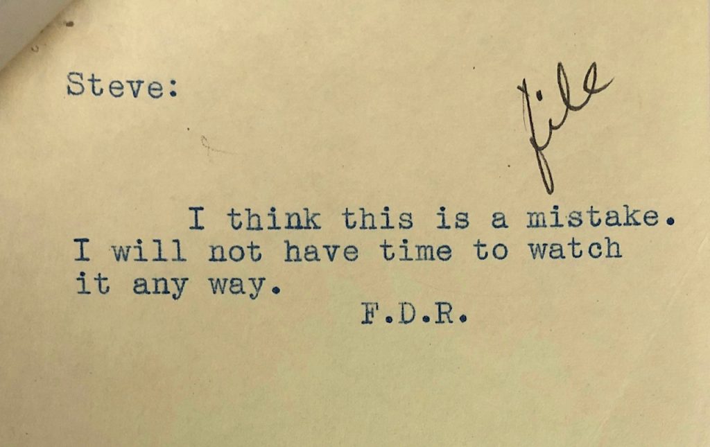 Later that morning, the American Pathe newsreel footage of the President delivering his speech was sent to New York City where it was developed and shown on TV at 3:30 PM, making FDR the first President to appear on television accepting his party’s nomination. Only a short snippet of his half-hour speech made it into the ten-minute broadcast. The newsreel footage was also shown in theaters.