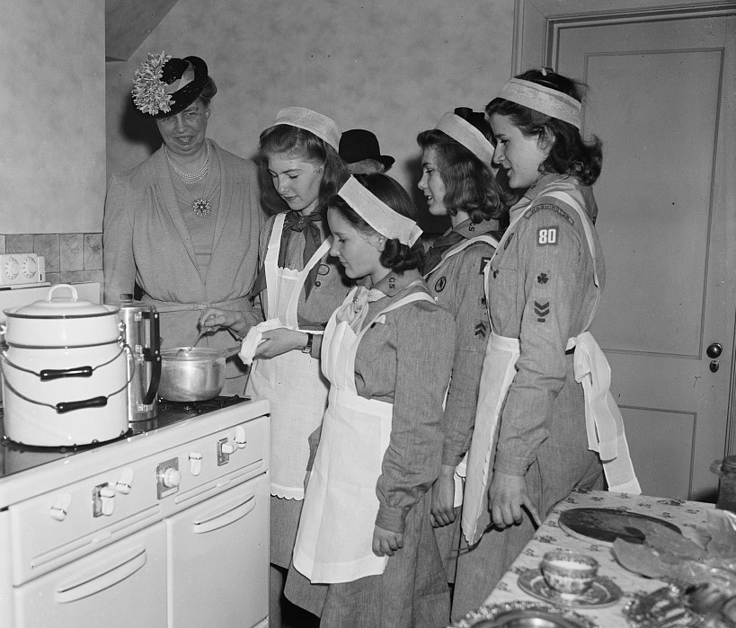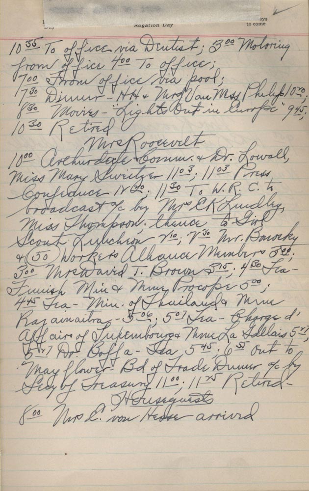 Though an important endeavor, the radio show was only one item on ER’s busy schedule that day. She blithely described a few highlights in her “My Day” column: “Today I began with a meeting of the Arthurdale, W. Va., Advisory Committee. Then I opened my series of broadcasts and went to my annual lunch with the Girl Scouts in their practice house.” She left out speaking to the Workers Alliance, hosting diplomatic teas, and capping the evening with nationally broadcast remarks to the Board of Trade. As for her radio salary, she donated it to the American Friend’s Service Committee.