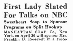 The new program aired every Tuesday and Thursday from a location convenient to the First Lady’s travel schedule. The makers of Sweetheart Soap, the Manhattan Soap Company, sponsored the program for an initial 13-week pick-up. The focus would be on issues of general interest to Mrs. Roosevelt or her daily activities, much like her syndicated column, “My Day.” She broadcast the first program from station WRC in Washington, DC.