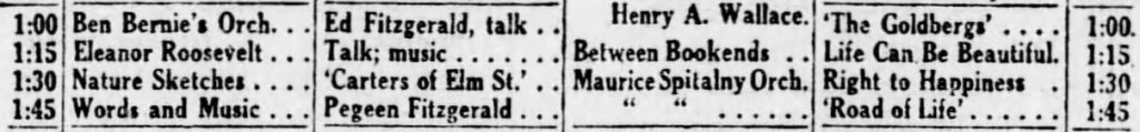 The quarter-hour program was carried over 46 NBC stations. Airing at 1:15 EST, Mrs. Roosevelt’s Own Program, as it was styled, faced stiff competition from the dramatic serial Life Can Be Beautiful and Ted Malone’s popular Between the Bookends. Well-known announcer Ben Grauer provided the introductions and read the commercials. According to a radio trade paper, the series ended its run on July 25, 1940, when the Manhattan Soap Company “shifted to spot advertising,” a polite way to note that it had been cancelled.